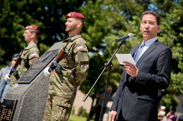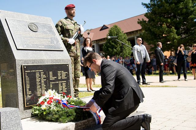 Uctili sme si pamiatku obetí v Polomke Štátny tajomník ministerstva obrany Róbert Ondrejcsák a náčelník Generálneho štábu OS SR genrál Milan Maxim spolu s americkým veľvyslancom Adamom Sterlingom a britským veľvyslancom Andy Garthom si dnes v obci Polomka pri pamätníku obetí USA a Spojeného kráľovstva Veľkej Británie a Severného Írska v Slovenskom národnom povstaní uctili ich pamiatku a odhalili im pamätnú tabuľu. Veľvyslanec USA dnes v Polomke ocenil člena 5. pluku špeciálneho určenia, ktorý získal významné ocenenie za chrabrosť počas nasadenia v operácii v Afganistane. Ten v noci zo 7. na 8. augusta 2015 pohotovou reakciou počas útoku na Kemp Integrity v Afganistane prispel k zabezpečeniu ochrany a bezpečnosti stoviek príslušníkov ozbrojených síl z viacerých krajín dislokovaných v Kempe. „Načasovanie tohto ocenenia práve na túto udalosť podčiarkuje spojenectvo USA a Slovenska, ktoré siaha do minulosti,“ uviedol americký veľvyslanec Adam Sterling. Príslušník 5. pluku bol ocenený Medailou uznania Spojených ozbrojených zložiek USA za chrabrosť. „Naša úloha v Afganistane, ako elementu špeciálnych síl, je trénovať a cvičiť afganských partnerov pre vedenie špeciálnych operácii,“ priblížil pôsobenie našich vojakov veliteľ 5. pluku špeciálneho určenia plukovník Miroslav Gardlo. Počas Slovenského národného povstania boli na povstalecké územie vyslané vojenské misie Spojencov, ktorých príslušníci na tomto území plnili špeciálne úlohy. Okrem sovietskej vojenskej misie tu pôsobili príslušníci amerického Úradu špeciálnych služieb (OSS – Office Strategic Service) a britského Úradu pre špeciálne operácie (SOE - Special Operatioins Executive). Obe misie boli vysadené na letisku Tri Duby v septembri 1944. Následne plnili svoje úlohy so spravodajskými orgánmi 1. čs. armády na Slovensku. Dňa 26. decembra 1944 zajala nemecká protipartizánska jednotka Abwehrgruppe 218 členov americkej a britskej jednotky nad obcou Polomka. Boli odvezení do koncentračného tábora Mathausen, kde ich po tvrdých výsluchoch 24. januára 1945 popravili